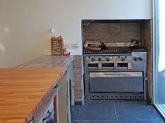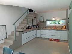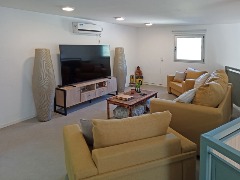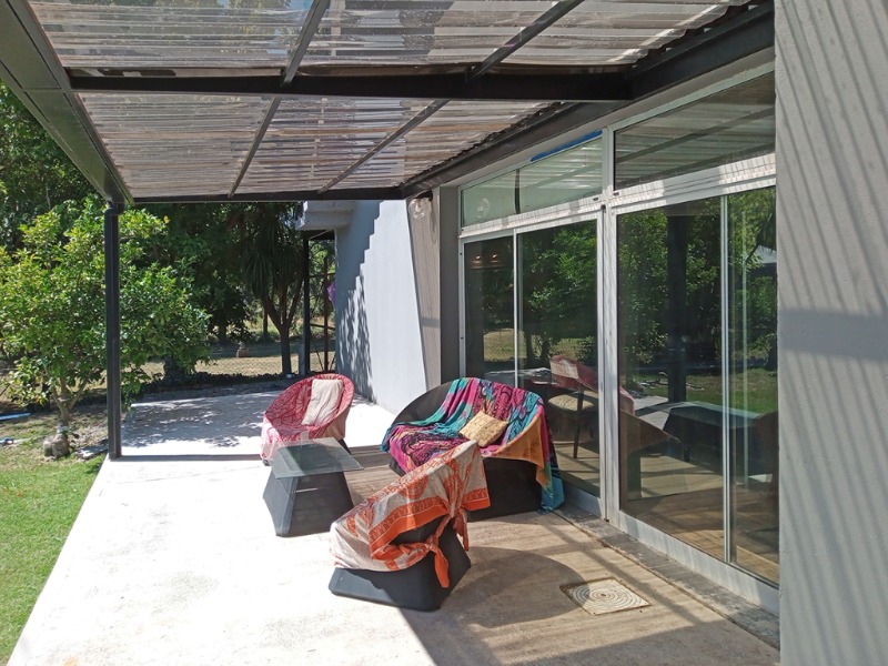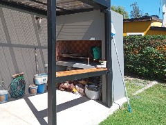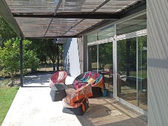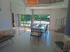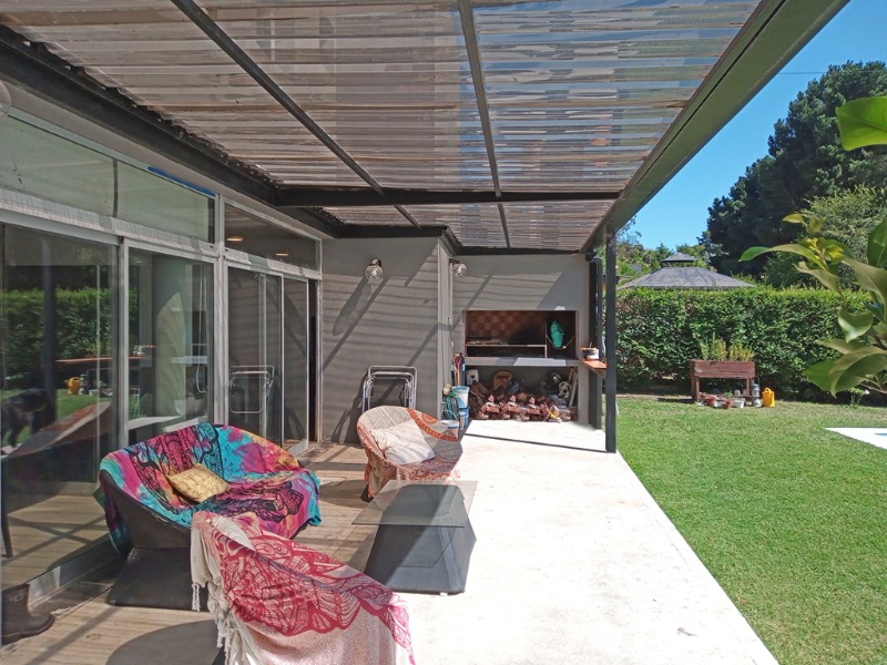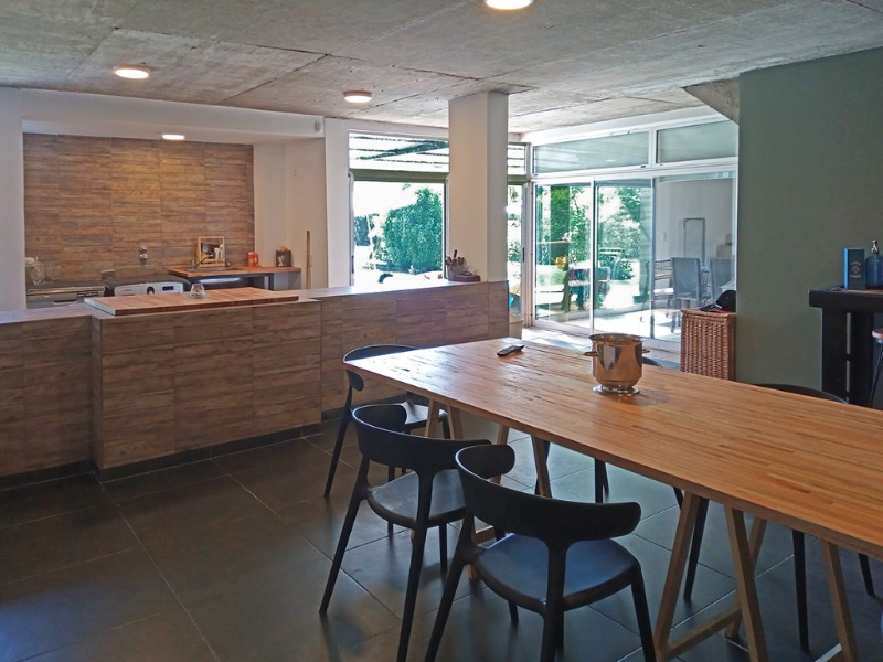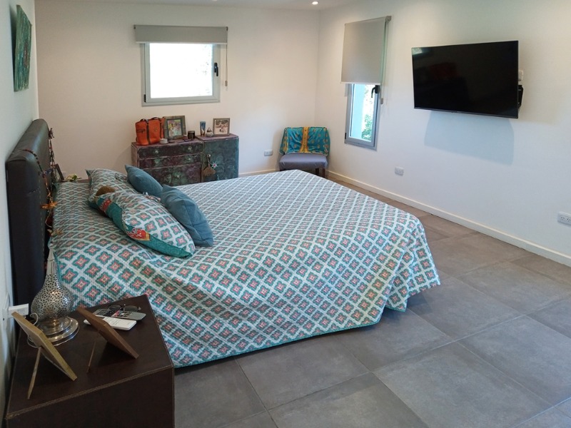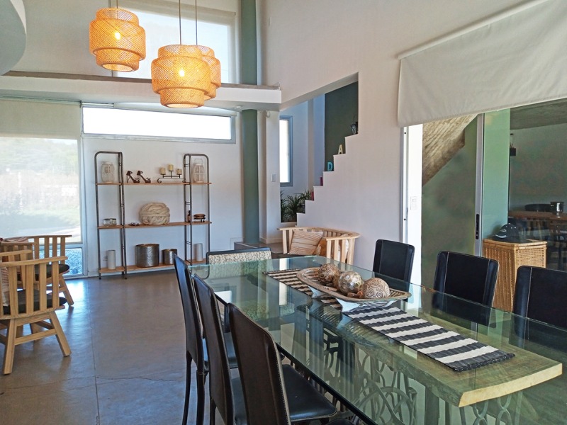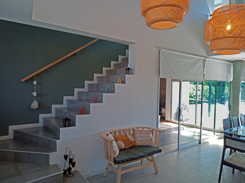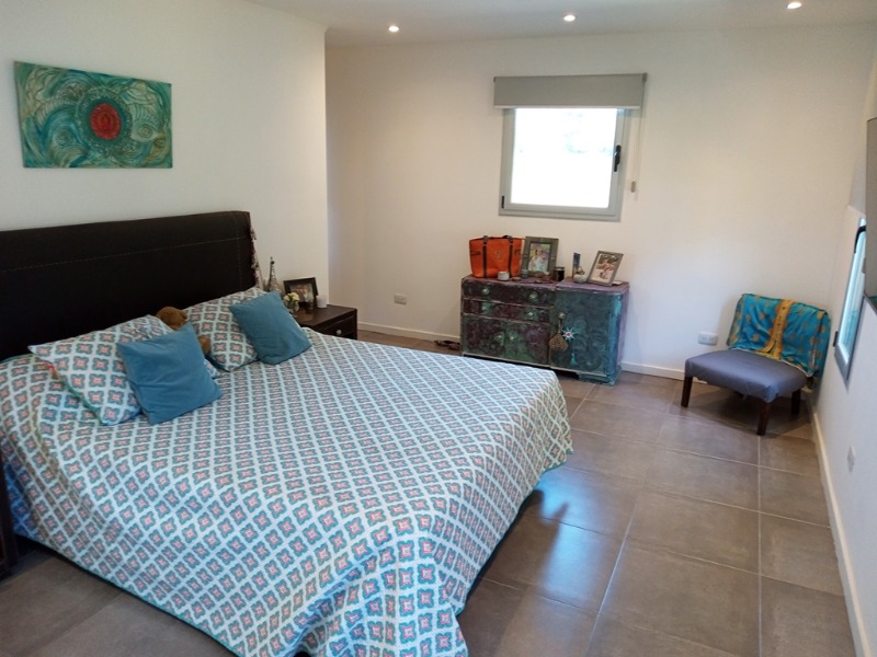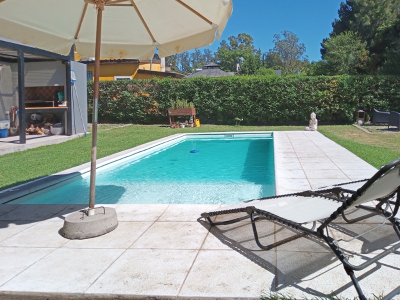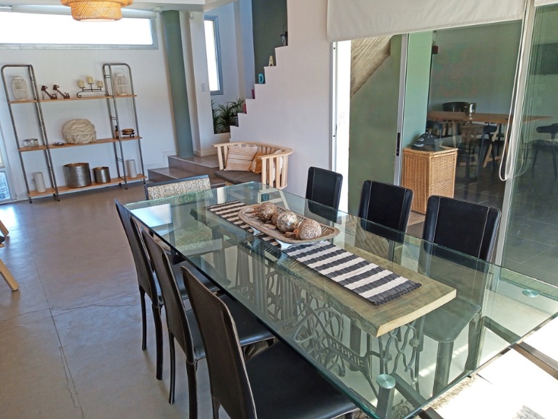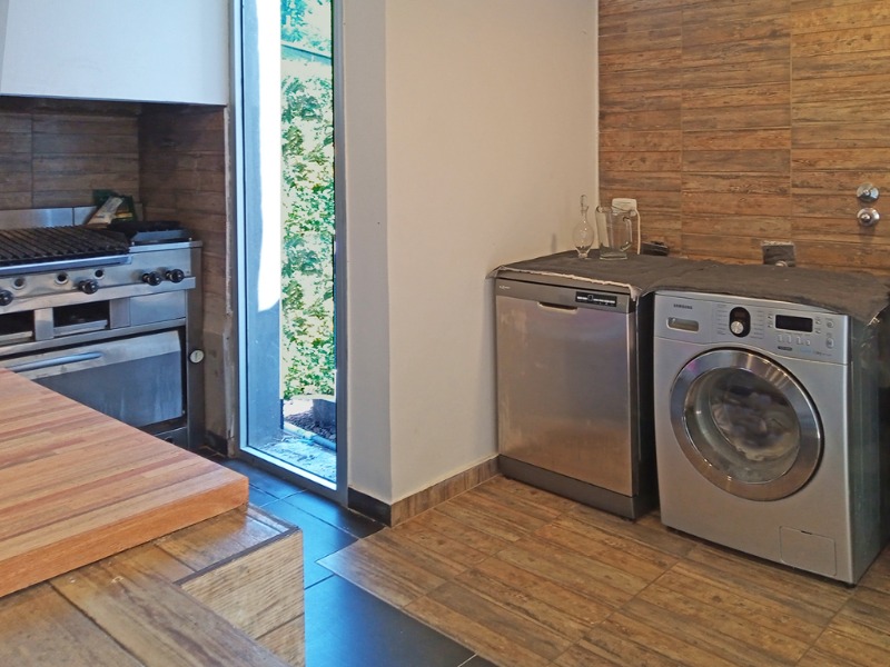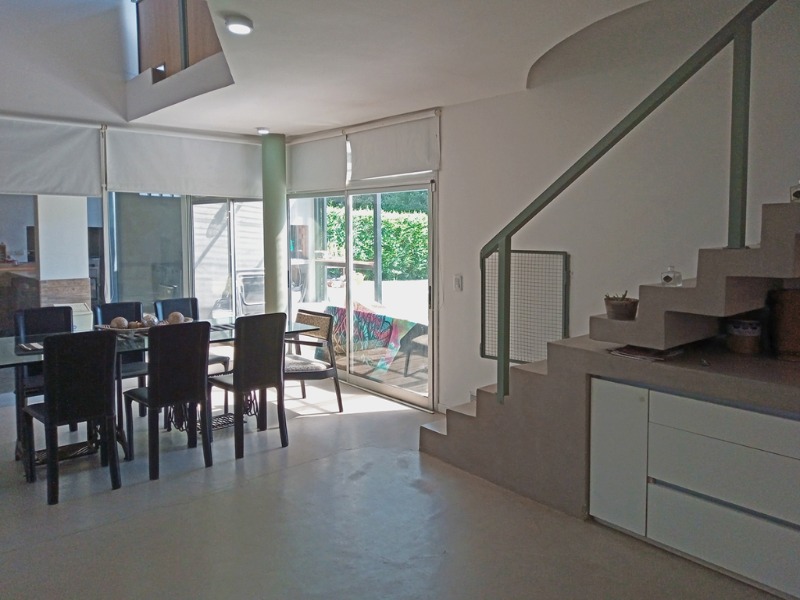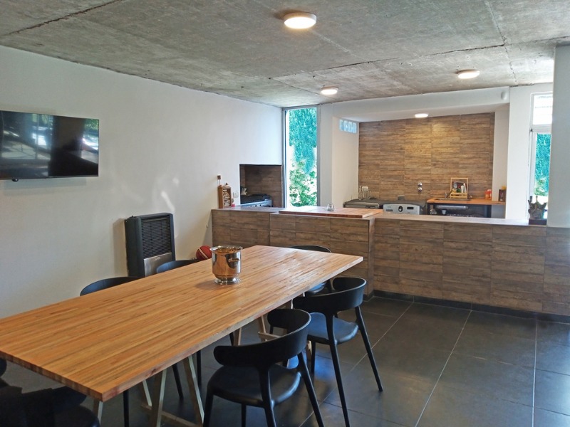 En la plata baja tenemos: Un estar que se continua con el comedor el cual está junto a una amplia cocina de diseño abierto. Desde el comedor a través de amplios ventanales nos comunicamos con la galería exterior que se ubica frente a la piscina la que también cuenta con una parrilla a leña. Desde el comedor también accedemos a un gran quincho que a su vez funciona como cochera doble con portón automático. Este cuenta con una amplia mesada con área de lavandería y generosa parrilla a gas con horno pizzero. En plata baja también tenemos un baño con ante baño.